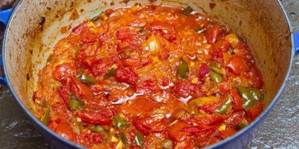 Sipati ulje u posudu, dodati paradajz razmućen sa supom, umešati sve ostale sastojke ipustiti da provri. Smanjiti temperaturu i kuvati istiha 15 minuta mešajući povremeno.