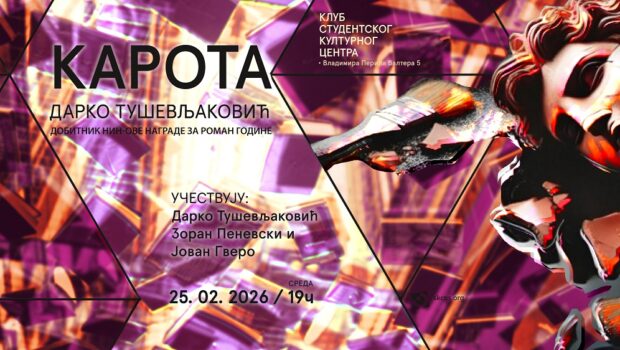 Promocija knjige „Karota” Darka Tuševljakovića, dobitnika NIN-ove nagrade za roman godine održaće se u sredu, 25. februara 2026. u 19 časova u Klubu Studentskog kulturnog centra Novi Sad (Vladimira Perića Valtera 5).Na promociji će, pored autora, govoriti Zoran Penevski, pisac i urednik ovog romana, a razgovor će voditi Jovan Gvero iz SKCNS-a. Darko Tuševljaković je rođen 1978. u Zenici, BiH. Prvu priču objavio 2002. godine u regionalnoj antologiji priređenoj u saradnji s Uneskom i od tada objavljuje kraću i dužu prozu u raznim časopisima i antologijama u zemlji i regionu. Godine 2004. dobio je nagradu „Lazar Komarčić“ za najbolju novelu. Dosad je objavio tri zbirke priča: