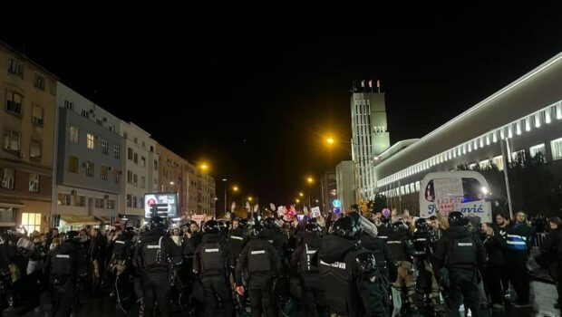 U Novom Sadu je večeras policija grubo gurala štitovima građane koji su pokušali da spreče odvoženje autobusa Milomira Jaćimovića ispred zgrade Banovine, a jedan pripadnik MUP-a snimljen je kako brutalno udara ženu koja je stajala u prvom redu.Policajac sa fantomkom na licu je udario šakom po glavi jednu ženu, na šta ga je druga žena odgurnula od nje. On je potom grubo odgurnuo i nju. Građanin i drugi policajac su pokušali da ga udalje rukom, dok su ostali vikali da prestane. "Je li tako i ženu biješ?", urlala je jedna Novosađanka, dok su drugi upućivali pogrdne reči policiji. Kamera pokazuje kako je i u narednim sekundama došlo do fizičkog kontakta policije sa građanima. Vidi se kako policajac zamahuje