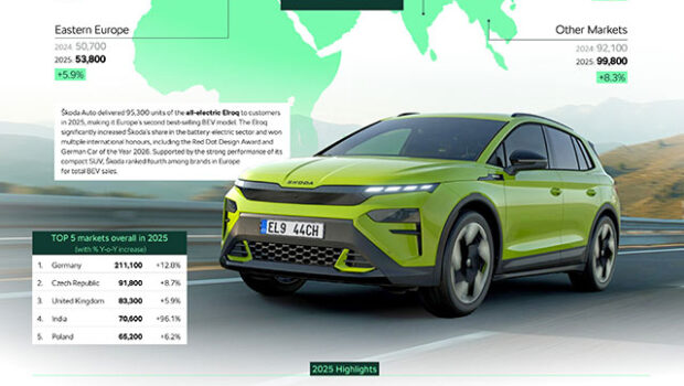 Škoda Auto je isporučila 1.043.900 vozila kupcima širom sveta (+12,7%) zabeleživši najjače prodajne rezultate u poslednjih šest godina.U Evropi (EU 27+4), Škoda je isporučila 836.200 vozila (+9,9%), po prvi put postavši treći najprodavaniji brend automobila na svom ključnom tržištu. Ključni pokretač ovog rezultata bio je uspeh Škodinih BEV i PHEV modela: svaki četvrti Škodin model (25,7%) isporučen je s utičnicom. Osim toga, snažna potražnja za Elroqom i Enyaqom podigla je Škodu na četvrto mesto među evropskim proizvođačima električnih vozila. Nemačka ostaje najveće Škodino tržište s 211.100
