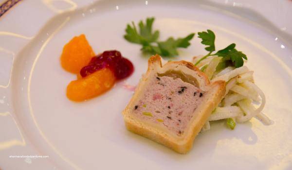 Dno I zidove kalupa za pastetu obložiti režnjevima slanine I posuti iseckanim crnim lukom, peršunom i krupnije samlevenim biberom. Zatim ređati u kalup teleće odreske posipajući svaki red iseckanim lukom, peršunom,mešanim začinima i solju. Ponoviti ovaj postupak dok se svi sastojci ne istroše. Preliti belim vinom i peći u umereno zagrejanoj pećnici (225°C)sat i po. Pečenu pastetu izvaditi iz kalupa, pritisnuti je daščicom i tegovima i ostaviti 24 sata na hladnom mestu.
