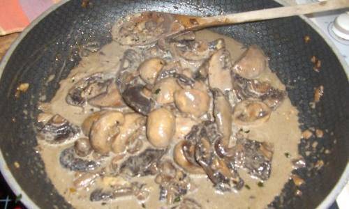 Propržiti crni luk na 10 grama maslaca, dodati pečurke i pirjaniti desetak minuta. Napraviti zapršku od preostalog maslaca i brašna, razrediti je supom ili vodom, posoliti i mešati na tihoj vatri dok se umak ne zgusne. Spustiti propirjanjene pečurke, kuvati još desetak minuta, pa dodati peršun.